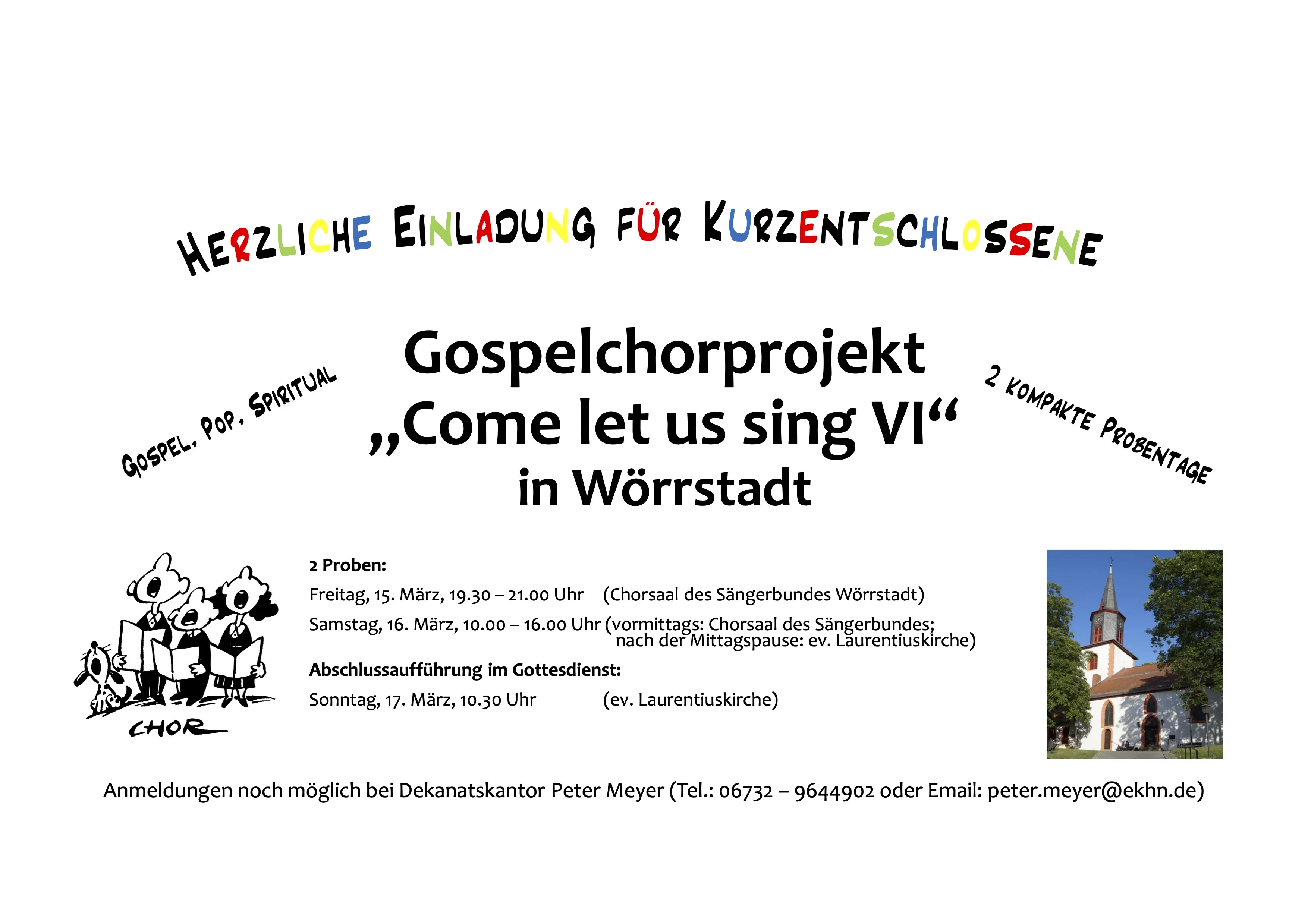 Freitag, 15. März 19:30 – 21:00 Uhr Chorsaal des Sängerbundes Wörrstadt (Hermannstraße 58, Eingang über Gärtnerstraße) Samstag, 16. März 10:00 – 16:00 Uhr vormittags: Chorsaal des Sängerbundes; nach der Mittagspause: Ev. Laurentiuskirche Wörrstadt Sonntag, 17. März 10:30 Uhr Abschlussgottesdienst Ev. LaurentiuskircheKurzentschlossene können sich gerne noch bis Anfang nächster Woche (11. März) bei mir anmelden. In allen Stimmen sind Sängerinnen und Sänger herzlich willkommen!